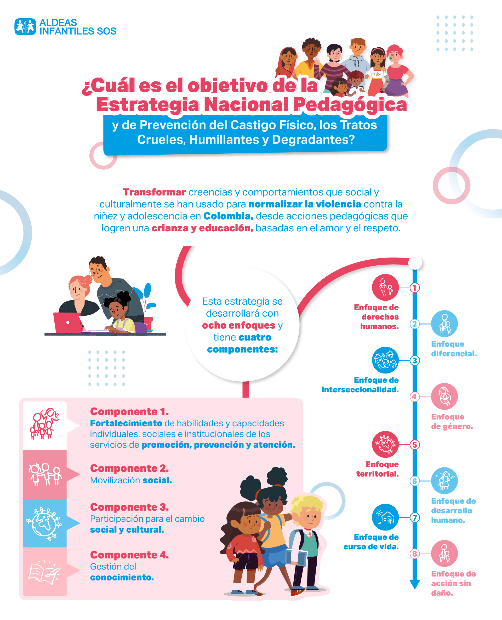 La Estrategia Nacional busca generar un cambio social para erradicar la violencia como método de corrección y crianza de los niños, niñas y adolescentes del país, y promover que se garanticen sus derechos mediante la articulación de las instituciones, las familias y la comunidad en generar entorno al cuidado y protección de la niñez.