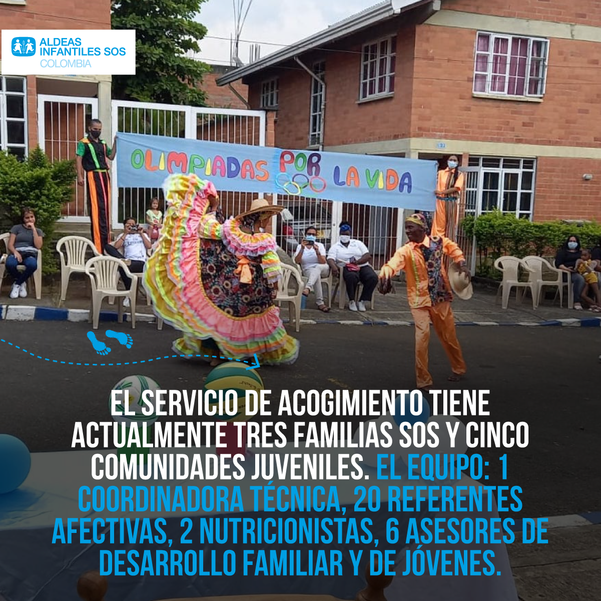 El servicio de acogimiento tiene actualmente tres Familias SOS y cinco Comunidades Juveniles, allí cuenta con un equipo profesional conformado por una coordinadora técnica, 20 referentes afectivos, dos nutricionistas, seis asesores de desarrollo familiar y de jóvenes.