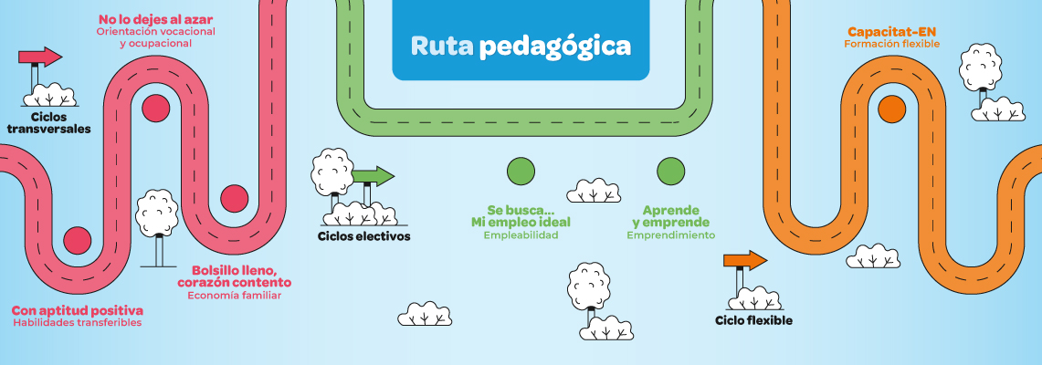 La ruta pedagógica es una metodología en la que los jóvenes adquieren conocimiento, potencian sus habilidades, identifican su orientación vocacional y profundizan en el tema de su interés, que puede ser: empleabilidad o emprendimiento. Y también se desarrollan capacidades como: empatía, trabajo en equipo, toma de decisiones y liderazgo.