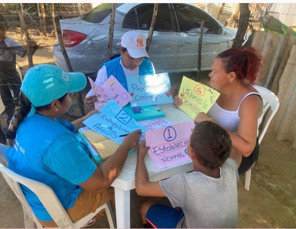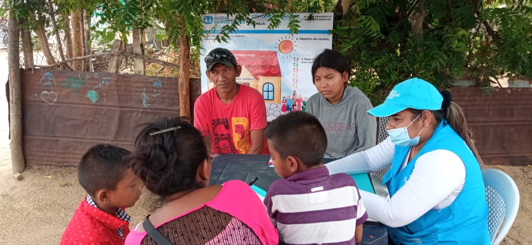María José explica el trabajo que día a día y durante varios años desde Aldeas Infantiles SOS se ha desarrollado con las familias migrantes, refugiadas y colombianos retornados que se desplazaron a La Guajira y, sobre todo, con quienes decidieron establecerse de manera permanente en los distintos municipios de ese departamento. Explica así el proceso: “hacemos una caracterización inicial, valoración central y se construye el plan de acompañamiento, que es el que contiene las acciones”, esto se logra mediante trabajo directo y personalizado con cada familia en sus hogares y en encuentros grupales con la comunidad.