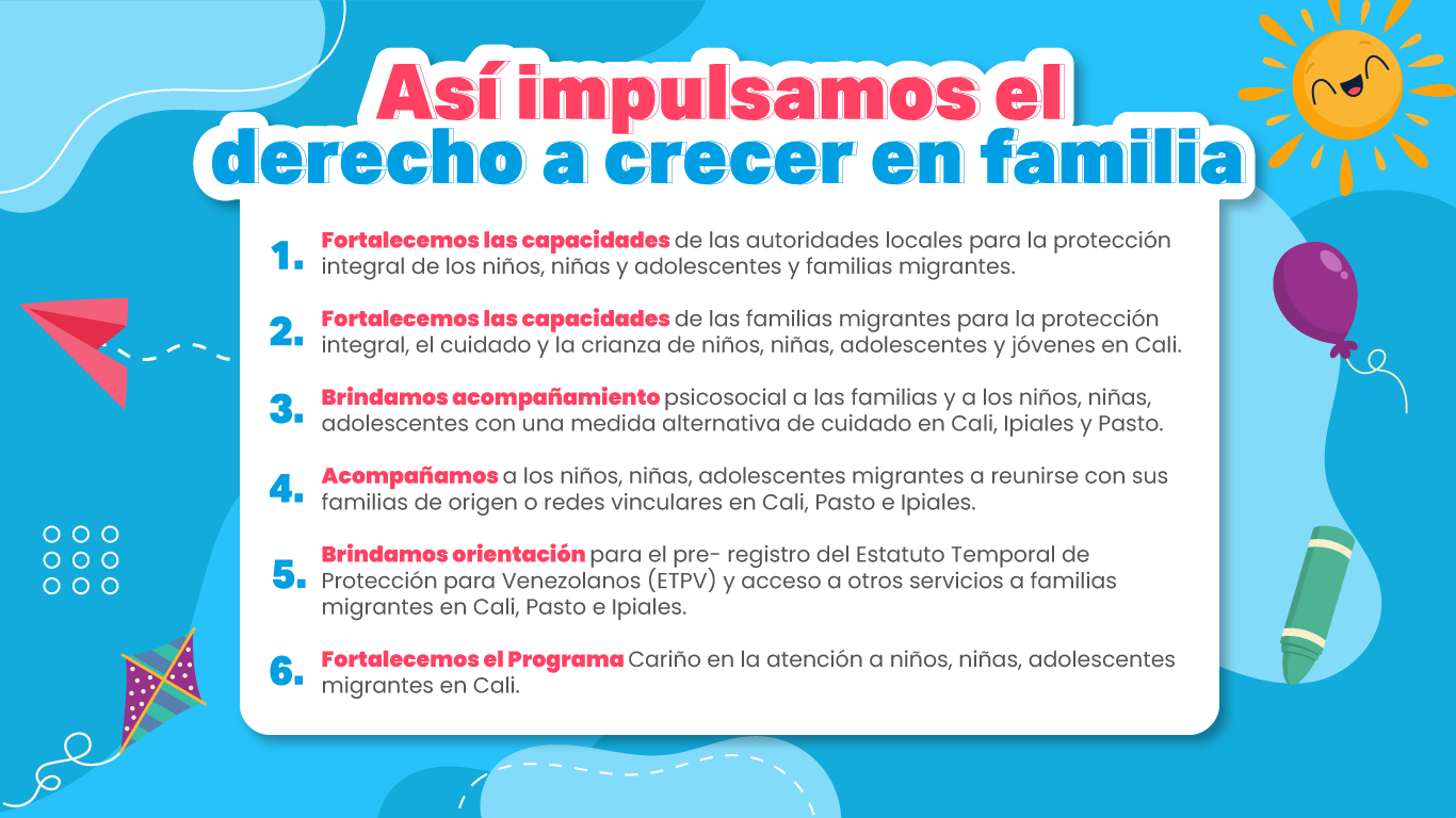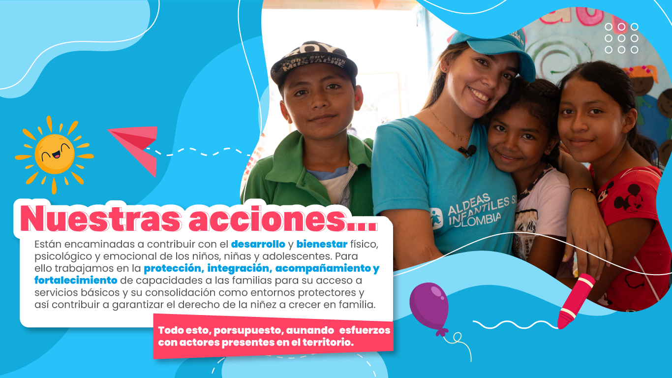 Para dar respuesta y proteger a los niños, niñas y adolescentes migrantes venezolanos y colombianos retornados en situación de vulnerabilidad, incluyendo aquellos no acompañados, separados de sus familias o en riesgo de estarlo, Aldeas Infantiles SOS en Colombia, en el marco del Programa Conectando Caminos por los Derechos de USAID, implementa un #ProyectoSOS para contribuir en la garantía de los derechos de la niñez y las familias migrantes a crecer en familia, y reducir los principales riesgos de protección.